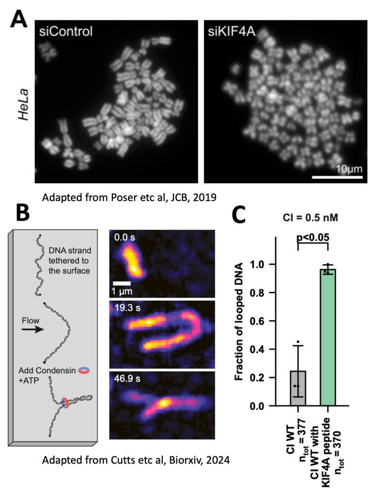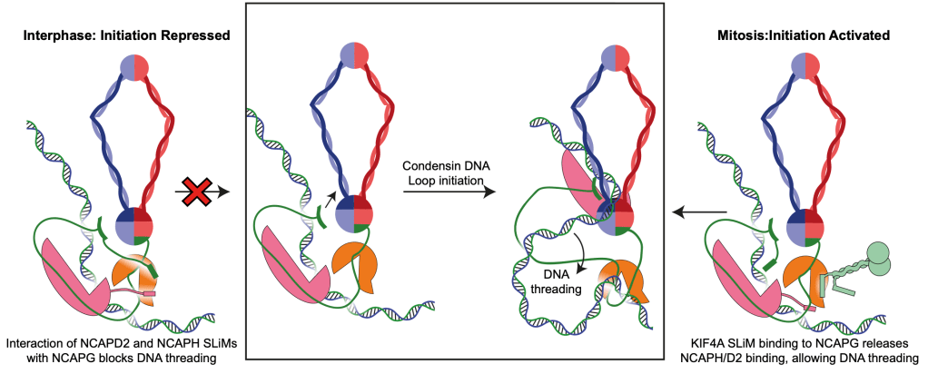 What about condensin I? Previous work found a kinesin, called KIF4A was needed for chromosomes to form correctly. You can see this in Figure A, from Poser et al, where KIF4A knock down makes chromosomes all fuzzy and fat. KIF4A had been shown to interact with condensin I and was required for its activity in cells, but we didn’t know the molecular mechanism. My work on condensin I suggests that in interphase it is autoinhibited by two “Short Linear Motifs” or SLiMs found in the disordered regions of NCAPH and NCAPD2, which bind NCAPG. KIF4A is able to activate condensin I by displacing the SLiMs of NCAPH and NCAPD2, and by just adding a short KIF4A peptide, we can see more condensin DNA loops in loop extrusion assays performed by our collaborators in the Kim lab (Figure B and C). This gives us a molecular mechanism, where KIF4A activates condensin I by allowing DNA loops to initiate, as shown in the below figure.