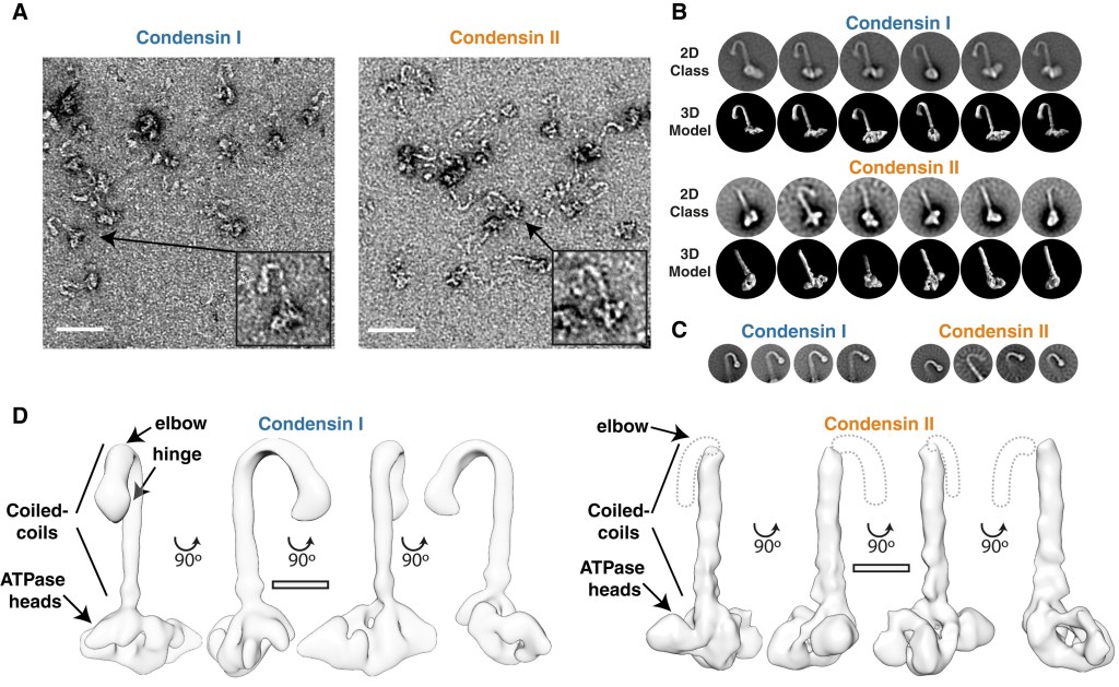 My first study on this was to characterise and compare of human condensin I and II. I could see they formed long complexes, which we can see in the EM data in the figure, that bound DNA, hydrolyses ATP and, in collaboration with the Green Lab, we showed condensin I and II could compact DNA, chromatin and loop DNA.
