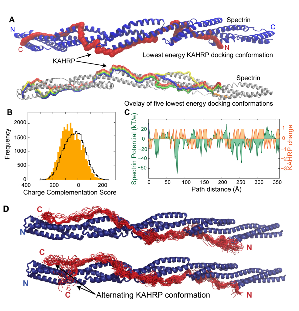When the Plasmodium falciparum malarial parasite infects a red blood cell, it completely remodels it to its own advantage. This remodelling results in 3D protrusions forming on the surface of red blood cell, which cause “cytoadhesion” where the infected cells stick to the blood vessel wall, preventing immune recognition. I studied two parasite proteins, PfEMP1 and KAHRP, which contribute to cytoadhesion. Both have large disordered regions, that glue and anchor them to the host red blood cell cytoskeletal protein, spectrin. My work narrowed down these interactions to specific sites, which nucleate the formation of these protrusions. Working with disordered proteins has its technical challenges, and required a combination of computational structural biology, with NMR, crystallography and biophysics. I also came up with a novel approach to look at KAHRP binding by examining how a disordered protein interacts with a structured surface (figure A) optimising complementary surface charge (figure C). We then subjected the model to molecular dynamics simulation, and can see this is predominantly stable but can explore alternate conformations.