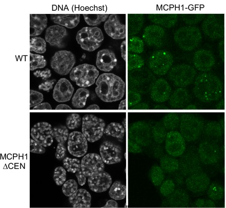 Condensin II is always in the nucleus, so why does it only compact DNA in mitosis? Mutations in the MCPH1 protein, which cause developmental disease, results in condensin II compacting DNA in interphase. In collaboration with the Nasmyth lab, I showed that MCPH1 bound condensin II via a central conserved “Short Linear Motif” or SLiM, and deletion of this “cen” region was sufficient to cause DNA condensation in interphase (shown in the figure). Short Linear Motifs play a huge role in regulating chromatin machines, hence exploring SLiM interactions is a key research theme of the Cutts lab.