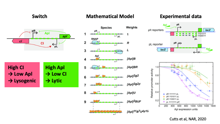 Bacteriophage can grow in two ways, lysogenically, where they integrated into the host bacterial genome, or lytically where they lyse the cell and grow like viruses. To decide between these growth modes, the bacteriophage 186 has a genetically encoded switch region which can be flipped by cellular conditions. The repressor protein, Apl, commits the phage to lytic growth, by binding to two sites; at the switch region, where it represses the promotor driving lysogenic growth, and also at the integration site, where it acts as an excisionase, promoting excision of the phage genome. I used mathematical modelling to understand how Apl binds using weak binding and cooperativity to form protein/DNA filaments to commit to lytic growth.